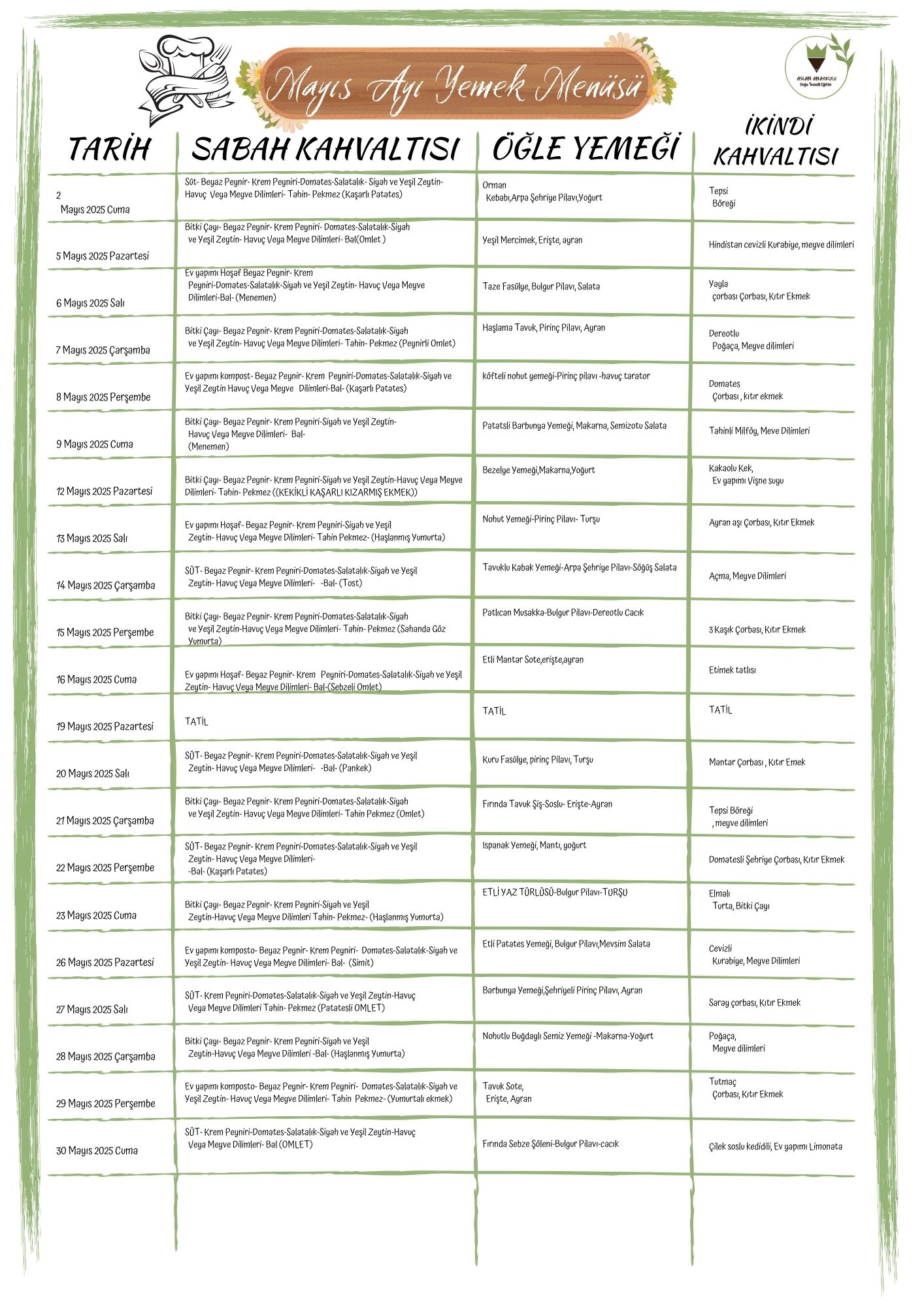 AYLIK YEMEK MENÜSÜ